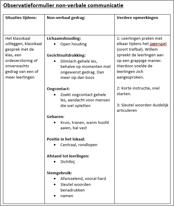 De bedoeling van deze leeractiviteit is, om alle non-verbale communicatie in kaart te brengen van mijn stagebegeleider. Non-verbale communicatie bepaald hoe je overkomt richting de leerlingen. Vandaar dat het belangrijk is om dit in kaart te brengen zodat ik mijzelf kan verbeteren in mijn POP. Non-verbale communicatie is zichtbaar in je lichaamshouding, gezichtsuitdrukking, oogcontact, gebaren, positie in de zaal, afstand tot de leerlingen en je stemgebruik.