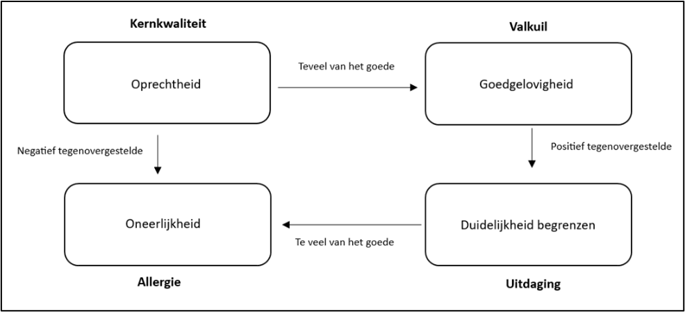 Dit kwadrant moet mij meer informatie geven waarom ik in bovenstaande situatie zo handelde. Ik ben een oprecht persoon. Ik laat zien wie ik echt ben en doe mijzelf niet anders voor. Ik toon echte betrokkenheid, niet alleen met woorden maar ook met houding en aandacht. Dit maakt mij betrouwbaar. Mensen weten wat ze aan mij hebben. Oprechtheid is een kernkwaliteit van mij. Het maakt niet uit of iemand iets persoonlijks, gezelligs of onzinnigs te vertellen heeft. Ik luister altijd oprecht en probeer de betreffende persoon altijd te begrijpen vanuit alle perspectieven. Zo zit ik eenmaal in elkaar. Ook op de momenten dat ik iets te vertellen heb, vertel ik de persoon in kwestie oprecht wat ik vind. Oprechtheid typeert niet alleen mij als persoon, maar ook als vakleerkracht. Mijn valkuil is dan ook goedgelovigheid. Ik kan leerlingen soms te veel vertrouwen geven. Zo ging ik ervan uit dat jongen B de waarheid vertelde tegen mij. Ik gaf de leerling vertrouwen en verwachte dat hij dit respecteerde. Jongen B was binnengeglipt, had gelogen en vervolgens non-verbaal mij genegeerd op moment van aanspreken. Het raakte mij niet dat hij de les verstoorde, maar omdat hij inging tegen iets wat ik belangrijk vind. Eerlijkheid en wederzijds respect. Mijn allergie is dan voornamelijk dan ook oneerlijkheid en onbetrouwbaar gedrag. Ik reageer extra gevoelig op manipulatie en liegen. Ik werd geraakt door het schenden van vertrouwen. Ik ben iemand die wil uitgaan van het goede in de leerling. Ik wil ruimte bieden, kansen geven en verbinding zoeken. Dat zijn mijn prachtige eigenschappen. Er is alleen hierbij wel een risico, zeker wanneer ik de leerling niet ken zoals jongen B. Willem gaf niet voor niks aan dat ik strenger had mogen zijn (stem verheffen en of zachtjes vastpakken), ook al past dat niet bij mij. Nu ik dit in kaart heb gebracht zie ik direct al dat ik mijn grenzen krachtiger moet begrenzen. Ik moet leren om mijn positie als lesgever in te nemen. Hierbij draait het om consequent handelen wanneer regels worden overschreden. Ook op zo’n moment dat een leerling een blokkade geeft, zoals jongen B, dat ik een reactie mag verwachten (en af te dwingen) wanneer dat nodig is. Ik moet niet te lang in vertrouwen blijven hangen wanneer gedrag om begrenzing vraagt.