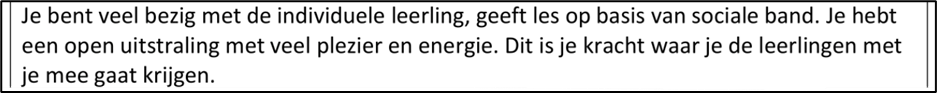 Als ik terugdenk op dit stagebezoek kwamen er twee punten direct bij mij naar boven. Wat zijn mijn persoonlijke eigenschappen en de daarbij horende gevolgen. Met andere woorden heb ik stil gestaan bij mijn natuurlijke, handige en trotse kwaliteiten en wat dit dan teweeg brengt in de praktijk voor de leerling.