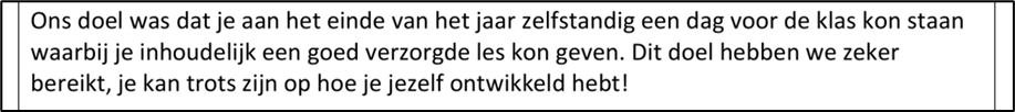 Ik heb mijzelf voornamelijk ontwikkeld in mijn klassenmanagement, structuur aanbieden en mijn normen en waarden terug laten komen in mijn lessen. Waar ik het meest trots op ben is dat ik nu vrijheid in gebondenheid kan toepassen in mijn lessen. Dit is waar ik in het begin van mijn stageperiode het meest tegen aanliep. Wanneer je dit bewust toepast maakt het je klassenmanagement en structuur aanbieden vele malen makkelijker. In het begin van semester 3 heb ik samen met Wisse en Bart een doel afgesproken, dat ik aan het eind van semester 4 zelfstandig les kan geven en daarmee zelfstandig voor een groep kan staan. Dit doel is bereikt!