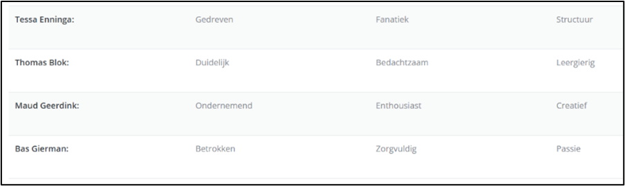 Wanneer ik een sportleraar moet vertalen in 3 woorden die ik zelf belangrijk vind zijn dat vertrouwen, respect en principes. Dit zou ik dus zelf ook willen nastreven. Nu heb ik een vraag gesteld aan medestudenten die mij van dichtbij hebben zien lesgeven. Ik vroeg aan hun wat 3 woorden zijn die mij momenteel vertalen als sportleraar.
