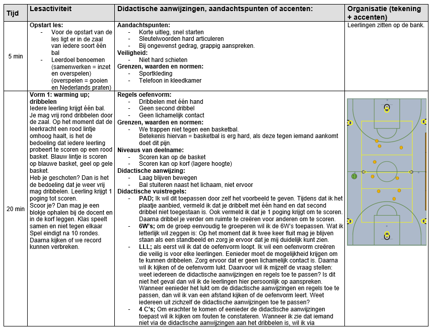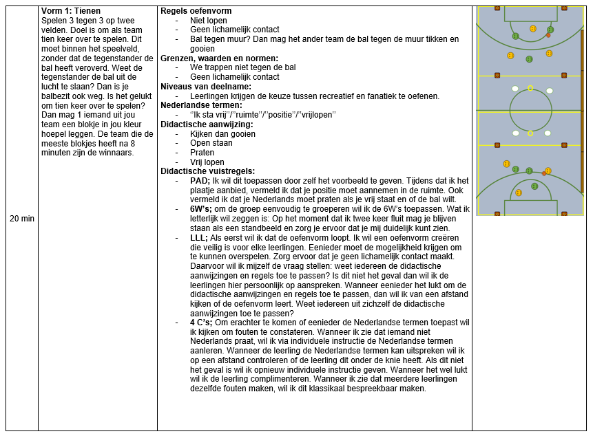 Het ontwikkelen van les 1 heb ik gebaseerd op mijn eigen visie en talentkrachtig onderwijs. De hoofddoelstellingen in les 1 zijn gericht op SEL en taalontwikkeling. Wat je mag verwachten in de les is dat dit wordt gegeven middels het vak concept ‘’het vormingstheoretische lichamelijke opvoedingsconcept’’. Tevens is het algemene uitgangspunt en doelstelling in de les gericht op het sociaal emotioneel leren (SEL) en persoonsvorming. Persoonsvorming start bij een omgeving waarin leerlingen zich veilig (sociaal en fysiek) en gezien voelen. Zo heb ik hier aandacht voor door duidelijke regels te hanteren en ruimte te laten voor emoties. Verder zijn de leerlingen bezig geweest met de sociale competentie ‘’relaties kunnen hanteren’’. Dit omvat sociale omgangsvormen zoals beleefdheid, samenwerken, sorry zeggen en dankbaarheid tonen (Van Der Heide & Kees van Overveld, z.d.). Leerlingen zijn hierin bezig geweest door met elkaar Nederlandse termen te leren tijdens de dialoogopdracht wat resulteert in het verbeteren van coachen en emotieregulatie. Binnen de ISK is taal beperkt beschikbaar om frustraties te uiten. Hierdoor kunnen leerlingen in het Nederlands aangeven waarom ze gefrustreerd zijn op een teamgenoot ‘’loopt niet vrij’’/’’staat niet in positie’’/ ‘’ziet geen ruimte’’. Verder zijn de leerlingen expliciet bezig geweest met het overspelen in de 3v2 spelsituatie en de eindpartij wat resulteert in samenwerken. Zo paste ik dwangstelling toe om één verdediger achter de aanvaller met bal te starten. Hierdoor creëer je een druk voor de aanvaller met de bal waardoor hij direct een keuze moet maken om de 1 tegen 1 uit te spelen of de bal over te spelen. Leerlingen gaan bewust of onbewust altijd voor de pass, zonder dat dit expliciet is benoemd. Ook is er ruimte voor autonomie binnen bepaalde kaders. Motivatie pak ik dan ook aan door gebruik te maken van de zelfdeterminatietheorie. Dit is een theorie van Deci & Ryan waarbij er gekeken wordt naar relatie, autonomie en competentie. Ieder leerling heeft recht om zich component te voelen middels succeservaring, verbondenheid en keuzemogelijkheden binnen hun zelfregulerend vermogen. Zo geef ik keuzemogelijkheden om te kiezen op welk niveau je aan de oefenvormen wilt deelnemen. Nu is het ook zo dat de leerlingen kunnen kiezen voor rustig of fanatiek oefenen. Hierdoor geef ik iedere leerling de ruimte om te oefenen en sporten op eigen niveau, waardoor voor iedereen de succeservaring wordt vergroot. Voor het kwetsbare individu heb ik ook aandacht besteed, door bewust in te spelen op mijn valkuilen. Dit heeft betrekking tot mijn eigen persoonlijk ontwikkelingsplan. Ik heb rekening gehouden met mijn assertieve en appellerend gedrag, wat voor kwetsbare leerlingen negatieve effecten kan hebben. Zo wil ik voor enkele leerlingen van meer leidend gedrag (zoals in het directe instructiemodel) naar coachend gedrag gaan. Het DIM blijft leidend om de hele klas aan het werk te krijgen, maar voor kwetsbare leerlingen wil ik meer maatwerk leveren door coachend op te treden.