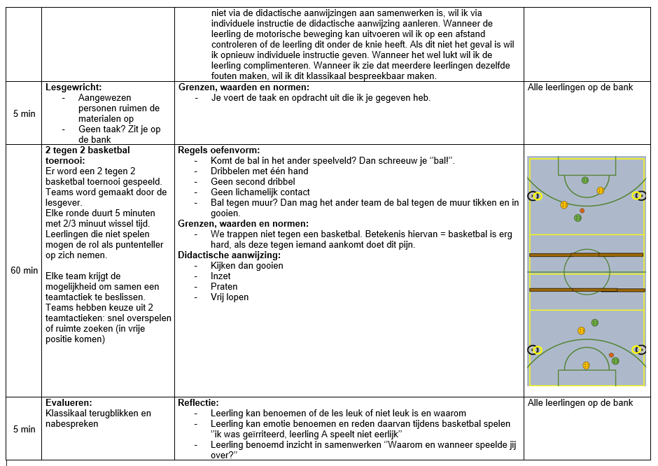 Op 15 december heb ik aan klas PMB2A de tweede basketbal les van mijn lessenreeks gegeven. Tijdens deze les hebben de leerlingen gewerkt aan het verbeteren van het bewust uitspelen van spelsituaties. Willen den Hartogh heeft tijdens de eindvorm voor mij geobserveerd hoe vaak er bewust werd overgespeeld naar een medespeler. Er zijn twee partijen van tien minuten gespeeld. Alle leerlingen zijn positief opgevallen in het bewust overspelen. Iedere leerling heeft vaker bewust overgespeeld. Dit is informatie waar we wat aan hebben! Wel kan het verschillende oorzaken hebben dat de leerlingen meer bewust hebben overgespeeld dan de eerste les. Zo heb ik klassikaal gereflecteerd in de tweede les, waarbij ik rekening hield met een actieve deelname van iedere leerling. Hierdoor konden leerlingen nadenken over hun eigen leerproces gericht op samenwerken. Ook ben ik bezig geweest met het verbeteren van mijn eigen klassenmanagement. Zo ben ik consequenter gaan handelen bij ongewenst gedrag. Hiervoor heb ik meerdere tactieken gebruikt. Zo was stap één: vragen om stilte. Word er tijdens mijn instructie voor de tweede keer door mij heen gepraat door de zelfde leerling? Dichtbij komen en persoonlijker aanspreken. Leid de betreffende leerling vooralsnog andere af? Dan zet je hem apart. Gelukkig was het niet zo ver gekomen! Na het persoonlijker aanspreken wouden leerlingen wel stil zijn en luisteren naar mijn instructie. Ook met het innen van de bal bij de afloop van een spel, moest ik dit doen met meer overtuiging. Leerlingen willen dan nog wel eens de bal wegtrappen, waarna ze doen alsof ze je niet gehoord hebben. Ik heb iedere leerling ‘streng’ aangesproken nadat een leerling dit gedrag vertoonde. Hierdoor blijf ik mijn grenzen, waarden en normen bewaken. Ik kreeg door het aanspreken geschrokken gezichten. Dit geeft aan dat ze vanaf nu weten wat mijn normen zijn. Vraag ik om de bal dan zorg je ervoor dat je de bal naar mij brengt. Verder zijn de leerlingen bezig geweest door met elkaar verschillende emoties binnen sport te bespreken tijdens de warming up. Dit werd gedaan aan de hand van casussen. Dit werd opgepakt door de hele groep. Nu is het zo dat ik meerdere casussen terug heb zien komen in de les. Zo heb ik tijdens de les een één op één gesprek gevoerd met jongen A. Hij werd boos omdat de tegenstander te fysiek speelde tijdens de eindpartij. Jongen A begon te schreeuwen tegen de tegenstander, wat duidelijk niet de juiste keuze is wanneer je dit wilt oplossen. Ik ben samen met de jongen gaan zitten en heb hem rustig kunnen krijgen. Ik kon dit moment heel mooi terug koppelen aan de warming up.