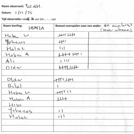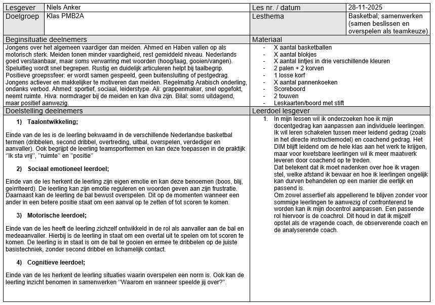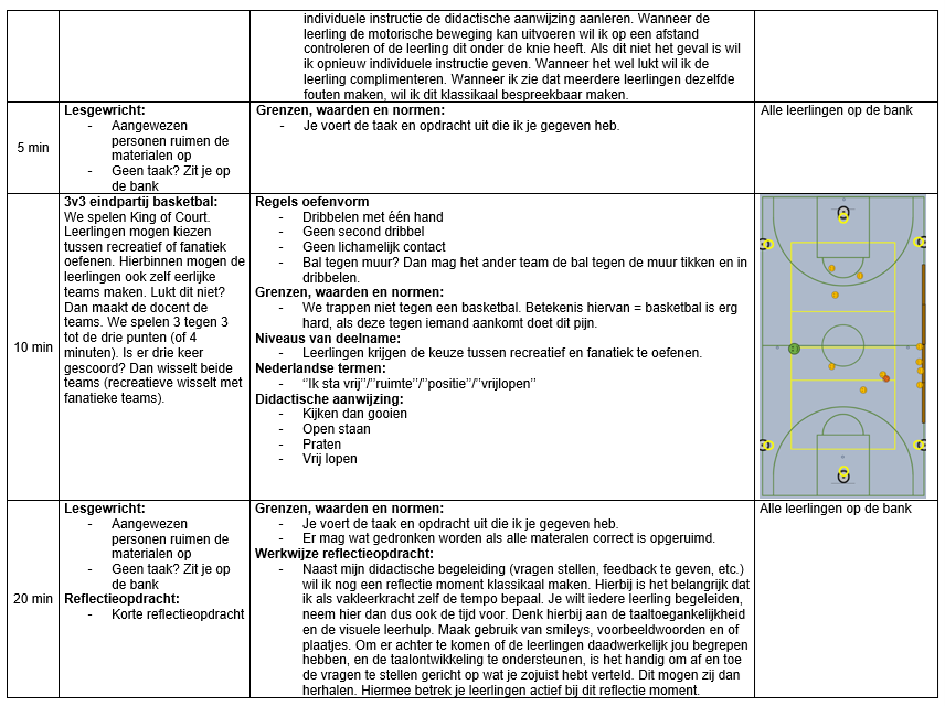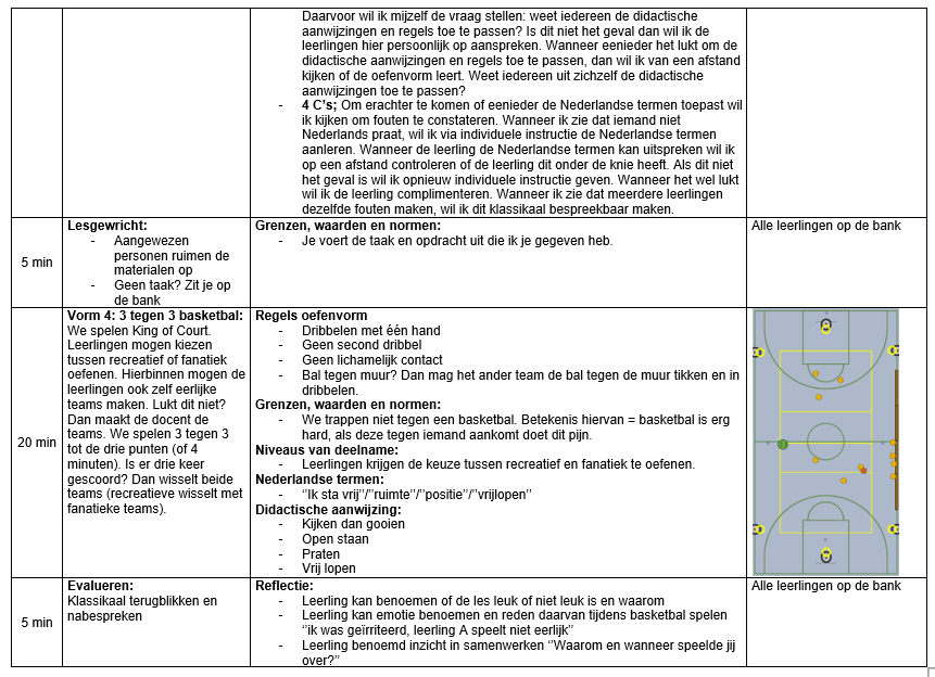 Op 1 december heb ik aan klas PMB2A de eerste basketbal les van mijn lessenreeks gegeven. Tijdens deze les hebben de leerlingen gewerkt aan het verbeteren van het bewust uitspelen van spelsituaties. Willen den Hartogh heeft tijdens de eindvorm voor mij geobserveerd hoe vaak er bewust werd overgespeeld naar een medespeler. Er zijn twee partijen van tien minuten gespeeld. Leerlingen die opvielen in het bewust overspelen waren Haben W., Haben A. en Dldar. Daarnaast viel het mij tijdens mijn eigen observatie op dat twee leerlingen (Haben W. en Dldar) Nederlands gebruikten om te communiceren en de bal te vragen tijdens de eindpartijen. Mijn ideale beeld was dat iedere leerling minstens tien keer bewust zou overspelen tijdens de eindvorm. Dit werd echter niet gehaald. De overige zeven leerlingen vielen minder op in de observaties. Dit kan meerdere oorzaken hebben, zoals motivatie, persoonlijke omstandigheden of mijn eigen handelen als lesgever. Wat ik in ieder geval weet, is dat mijn klassenmanagement tijdens deze les niet optimaal was. Zo praatte Yohanes meerdere keren door mijn openingspraatje heen. Ook tijdens de instructie van de warming up moest ik hem drie keer waarschuwen. In de eindvorm merkte ik dat hij liever niet wilde meedoen en anderen hierin meenam. Dit deed mij direct denken aan de sneeuwbalmetafoor: kleine ongewenste gedragingen kunnen snel uitgroeien tot grote problemen wanneer je ze niet tijdig corrigeert. Op mijn vorige stageplek, het Preadinius Gymnasium, had ik weinig moeite met klassenmanagement. Ook op de sport BSO kan ik kinderen gemakkelijk aanspreken op hun gedrag en hier consequenties aan verbinden. Dit is normaliter een talent van mij. Dit jaar ervaar ik dat echter als lastiger. Ik voel weerstand om streng te zijn of ‘nep boos’ te worden, omdat ik weet dat de leerlingen al genoeg aan hun hoofd hebben. Ik merk daardoor dat ik coulanter voor de groep sta en dat mijn grenzen vaker worden overschreden. Door de taalbarrière is het soms onduidelijk of normen en waarden bij alle leerlingen helder zijn. Het is mijn taak om dit voor iedereen duidelijk te maken. Omdat ik klassikaal niet veel aan het woord ben, vind ik het belangrijk dat leerlingen aandachtig luisteren op de momenten dat ik instructie geef. Tijdens het openingspraatje keek ik Yohanes meerdere keren bewust aan wanneer hij anderen afleidde. Dit zorgde steeds voor korte momenten van betrokkenheid, maar het hield niet lang stand. Ik had mijn grens eerder moeten aangeven door hem direct persoonlijk aan te spreken. Ook tijdens de instructie was drie keer waarschuwen eigenlijk te veel. Ik had hem even apart moeten zetten, zodat hij kon reflecteren op zijn gedrag. Daarna had ik een kort één op één gesprek met hem kunnen voeren. Tijdens de eindpartij had ik weinig grip meer op een klein groepje leerlingen. Hierdoor was de betrokkenheid lager en deden paar leerlingen niet meer fanatiek mee. Wat ik anders had kunnen doen was sneller en consequenter ingrijpen wanneer leerlingen afwijken van mijn verwachtingen. Ik heb in deze les duidelijk ervaren wat de gevolgen zijn van onvoldoende klassenmanagement. Zo zag ik onrust en minder betrokkenheid tijdens mijn instructies en een lagere intensiteit tijdens de eindvorm. Daarom wil ik sneller positief gedrag benoemen zodat dit gedrag wordt beloond en gezien. Voor de volgende les wil ik gedragsregels formuleren die ik tijdens de les wil nastreven. Zo wil ik dat iedereen luistert wanneer ik mijn openingspraatje of een instructie geef. Ook houden we het materiaal stil wanneer er uitleg is. Einde van de les wil ik hierop reflecteren of het nastreven hiervan gelukt is.