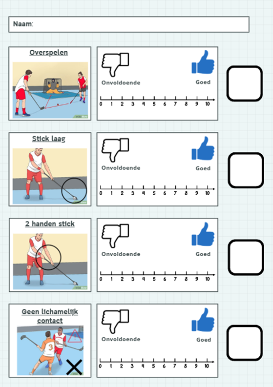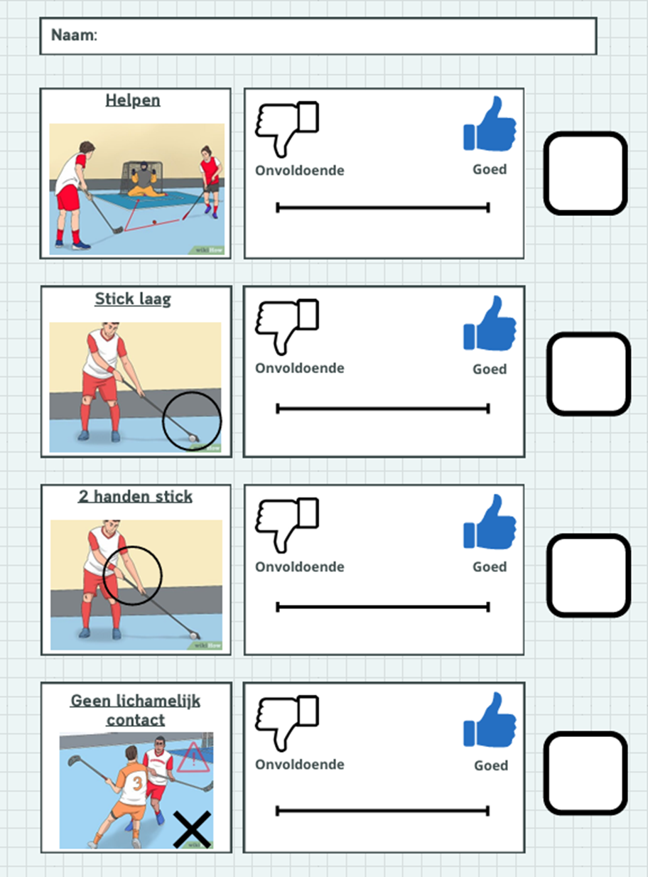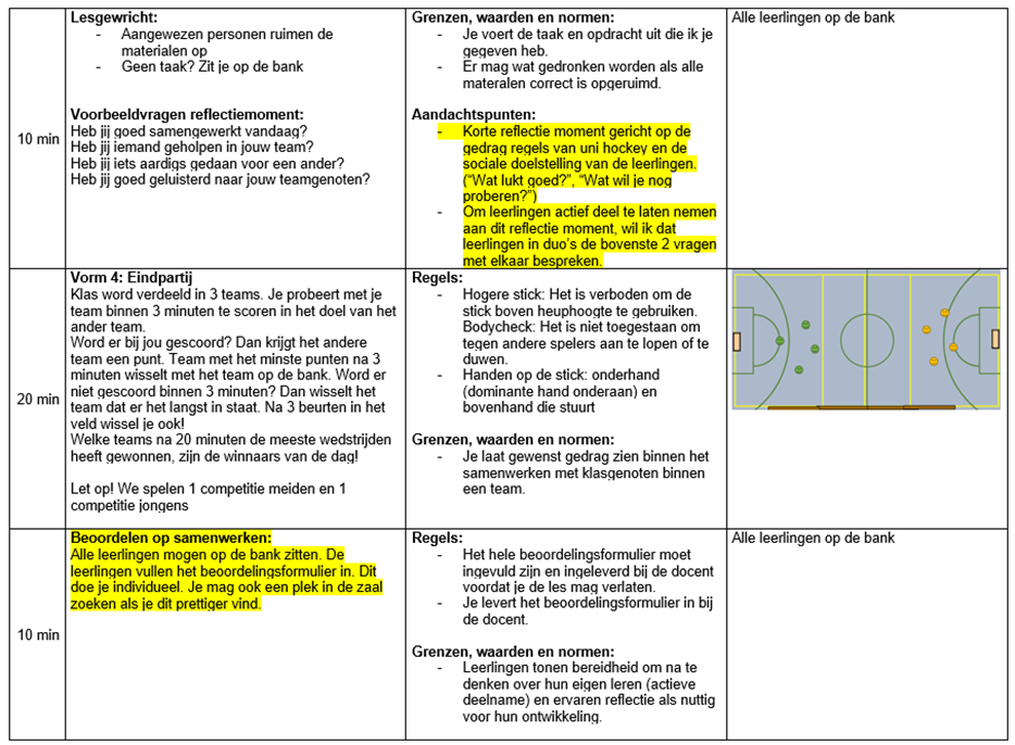 Fase 3; reflectie moment. In deze fase wil ik elke leerling een mini-reflectieformulier geven met visuele ondersteuning die zij vervolgens bij mij moeten inleveren. Met visuele ondersteuning bedoel ik het gebruik maken van plaatjes en eenvoudige Nederlandse voorbeeldzinnen/woorden. Leerlingen reflecteren op hun gedrag (gedragsregels unihockey en samenwerken/helpen). Het is toegestaan om te overleggen met een ander. In deze fase hebben de leerlingen 1 leerdoel geformuleerd waarmee zij individueel aan de slag gaan tijdens de volgende oefenvorm.