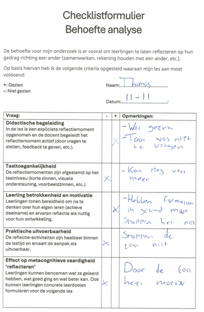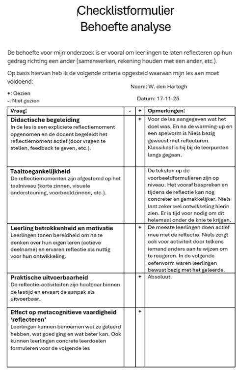 Om concrete criteria vast te stellen waaraan het protocol moet voldoen, heb ik verscheidene observaties uitgevoerd tijdens de lessen van mijn stagebegeleider en ben ik meerdere keren met hem hierover in gesprek geweest. De behoefte is er vooral om leerlingen te laten reflecteren op hun gedrag richting een ander (samenwerken, rekening houden met een ander, etc.).