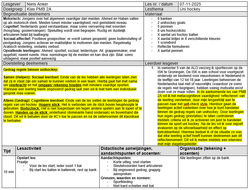 Op maandag 3-11 heb ik een les uni hockey verzorgt op de ISK te Groningen. Hierbij was er een situatie waarbij leerling A regelmatig ongewenst gedrag vertoonde. De regel binnen het beoefenen van de sport uni hockey is heel duidelijk. De stick moet onder de knie blijven anders maak je een fout/overtreding. Daarnaast is het fysiek en sociaal onveilig. De kans bestaat dat je met de stick andere leerlingen onbewust raakt. Daarnaast kunnen leerlingen hier bang van worden en niet de ruimte krijgen om zichzelf optimaal te ontwikkelingen.