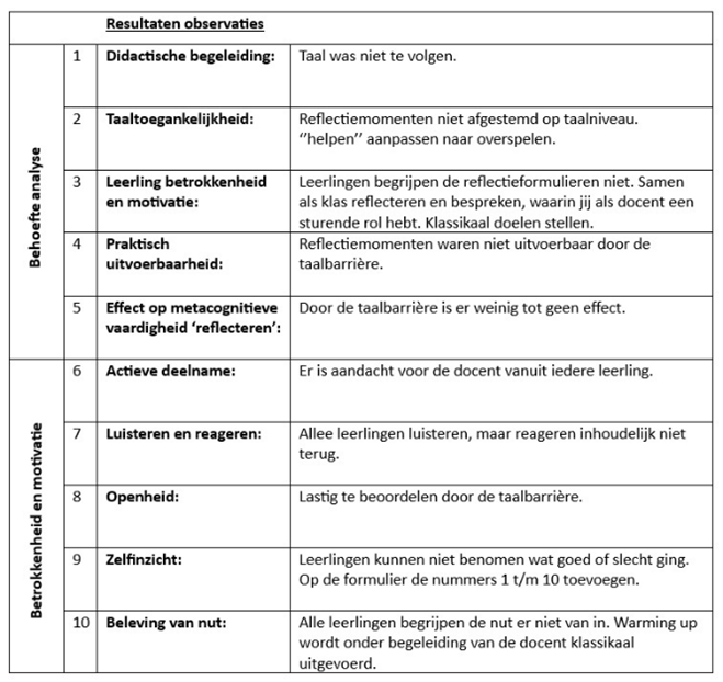 De behoefteanalyse is sterk doordat het probleem is gebaseerd op concrete lessituaties binnen de ISK. De observaties tijdens volleybal en uni hockey maken duidelijk dat leerlingen moeite hebben met reflecteren en gedragsregulatie. Hierdoor is het probleem herkenbaar en praktijkgericht. De behoefteanalyse is voornamelijk gebaseerd op het perspectief van de docent en onderzoeker. Leerlingen zijn niet expliciet bevraagd waardoor het leerlingperspectief ontbreekt. Ook is het aantal stakeholders beperkt wat de diepgang van de randvoorwaarden en criteria had kunnen versterken. Nu is het zo dat de observaties als belangrijkste meetinstrument is gekozen. Dit heeft de onderzoeker gedaan door de beperkte taalvaardigheid van ISK leerlingen. De combinatie van observaties, reflectieformulieren en mondelinge checks vergroot de validiteit door triangulatie. De interventie is dan weer wel sterk doordat deze theoretisch onderbouwd is en na evaluatie is aangepast. Het herontwerp met klassikale en docentgestuurde reflectie en visuele ondersteuning sloot beter aan bij de doelgroep en leidde tot zichtbaar verbeterd gedrag en hogere betrokkenheid. De interventie kan ook zwak zijn doordat de leerling afhankelijk is van de docent tijdens het reflectiemoment. Daarnaast zorgde de taalbarrière in de eerste uitvoering wel weer voor tijdverlies en onduidelijkheid. Tot slot is de interventie kortdurend uitgevoerd, waardoor langetermijneffecten niet vastgesteld kunnen worden.