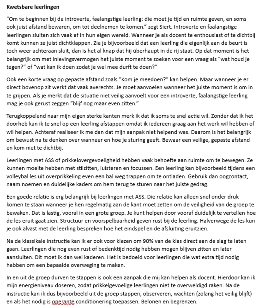 Om aan te kunnen tonen dat ik voldoe aan de leeruitkomst ‘onderzoekend vermogen’, heb ik een onderzoek uitgevoerd op basis van een probleem waar ik tegenaan liep met het lesgeven. Hiervoor ben ik in de literatuur gedoken, en heb ik hier relevante wetenschappelijke artikelen voor gevonden. Vervolgens heb ik daar een passend plan voor uitgewerkt, zodat ik dit vervolgens in de praktijk kon uitvoeren. Op de verkregen data heb ik teruggeblikt. Ook heb ik onderzoek gedaan naar kwetsbare leerlingen in een LO les. Dit onderzoek ging over het herkennen hiervan en wat ik hierin kan betekenen als lesgever.