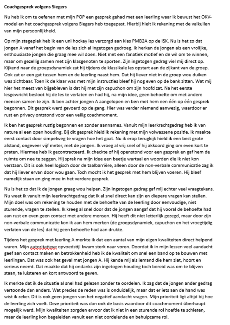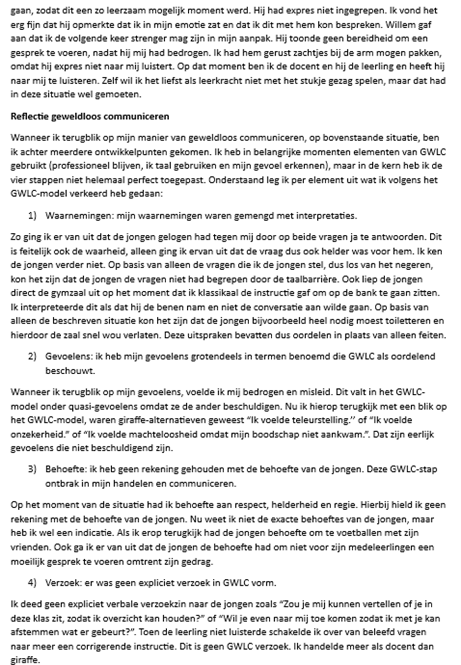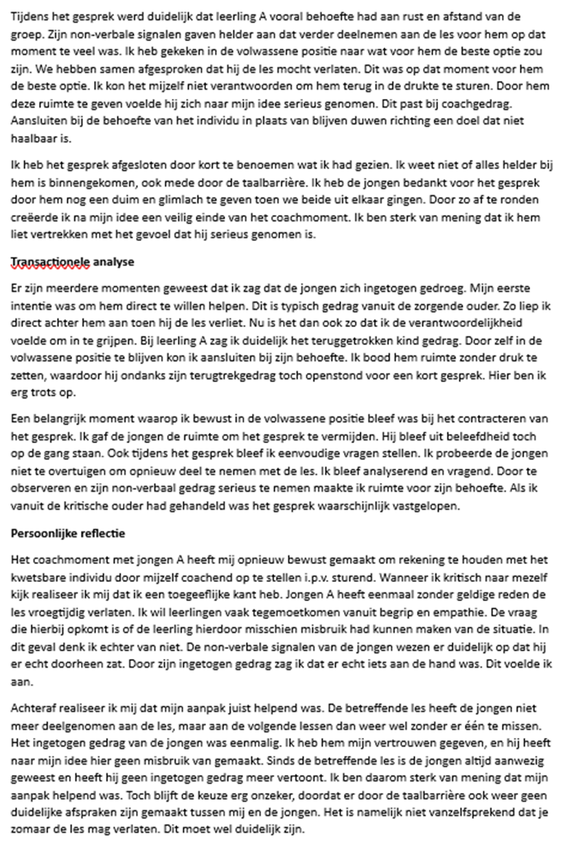 Door mijn persoonlijke eigenschappen te analyseren ben ik mij meer bewust geworden van mijn invloed op kwetsbare leerlingen en kan ik mijn pedagogisch handelen hier beter op afstemmen. Daarnaast heb ik mij ontwikkeld door mijn lesgeefstijl aan te passen van sturend naar meer coachend. Dit heeft mij geholpen om leerlingen meer ruimte te geven, vertrouwen op te bouwen en hen te ondersteunen in hun sociaal-emotionele ontwikkeling. Het toepassen geweldloos communicatie heeft mijn communicatievaardigheden versterkt en draagt bij aan een veilig pedagogisch leerklimaat.