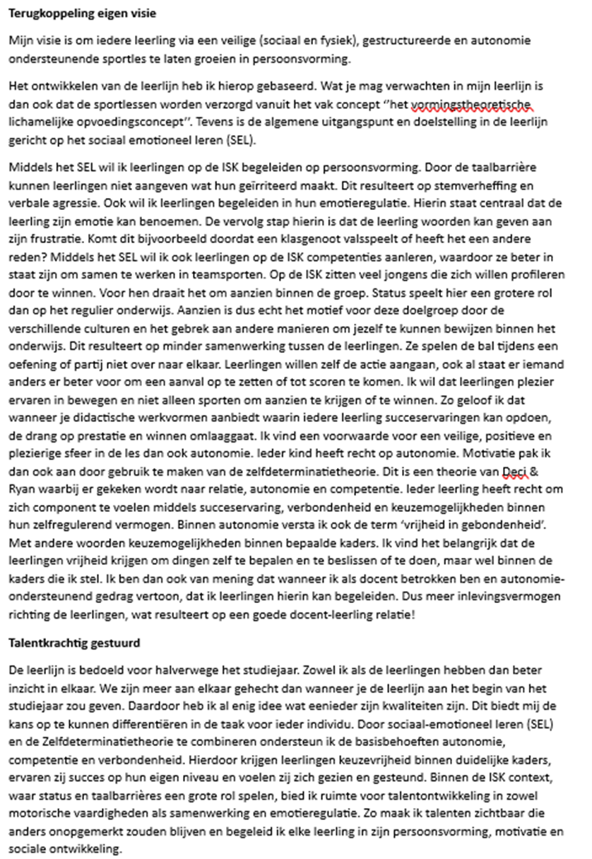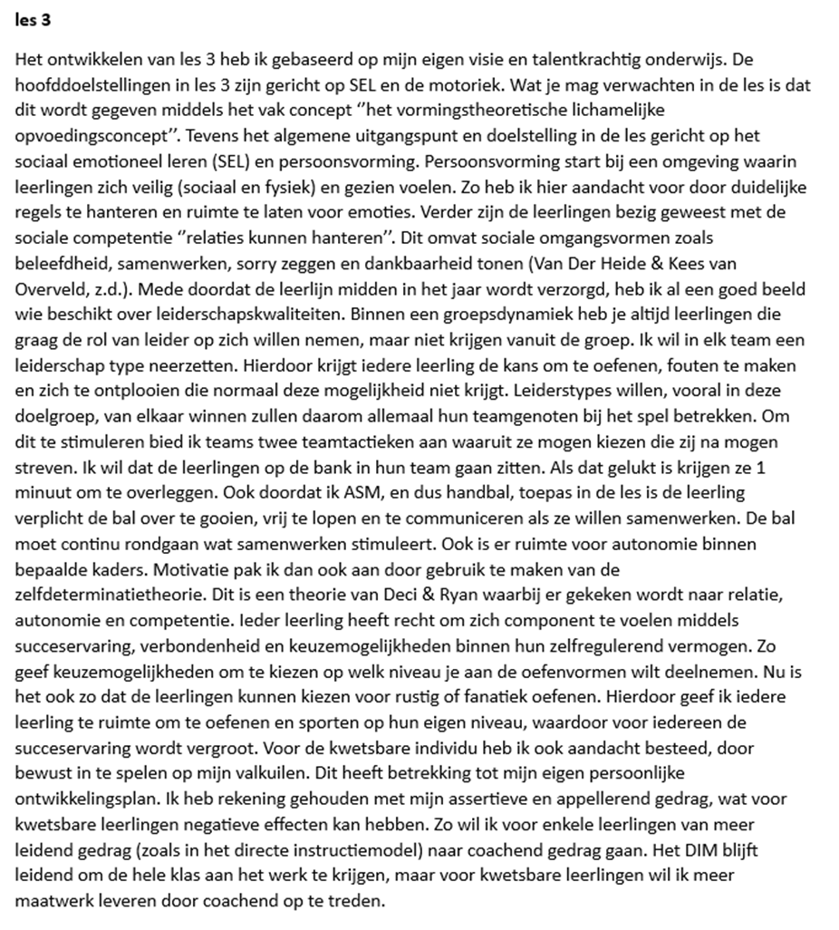 Wat ik echt goed vond gaan is dat ik mijn visie in mijn lesvoorbereidingen terug laat komen. Dit heb ik helemaal uitgeschreven en verantwoord zodat dit voor eenieder duidelijk is. Waar ik ook blij mee ben is dat ik een leerlijn heb uitgewerkt.