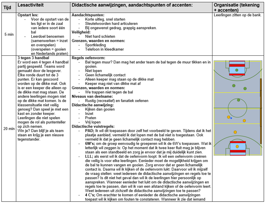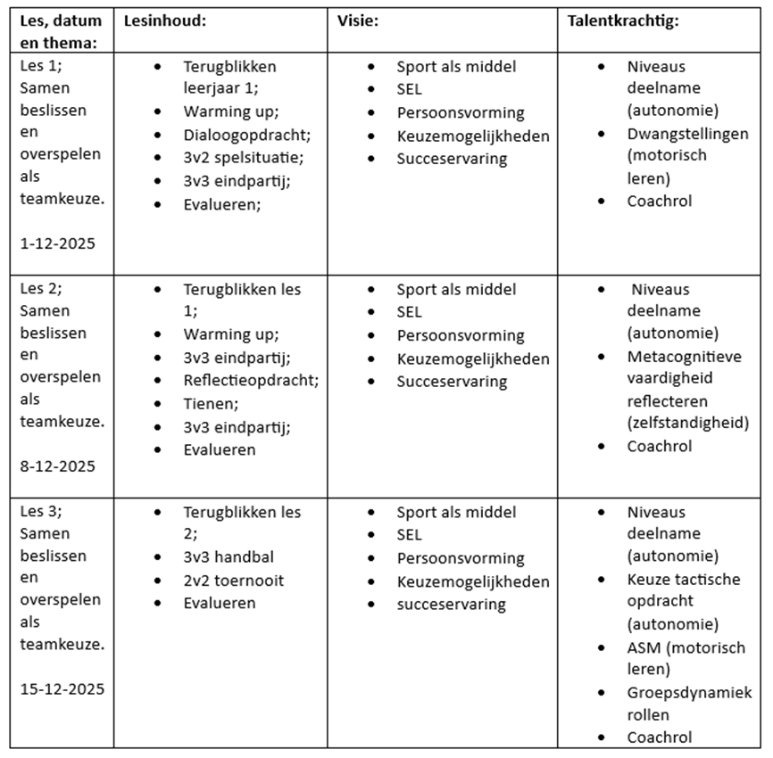 Het ontwikkelen van les 3 heb ik gebaseerd op mijn eigen visie en talentkrachtig onderwijs. De hoofddoelstellingen in les 3 zijn gericht op SEL en de motoriek. Wat je mag verwachten in de les is dat dit wordt gegeven middels het vak concept ‘’het vormingstheoretische lichamelijke opvoedingsconcept’’. Tevens het algemene uitgangspunt en doelstelling in de les gericht op het sociaal emotioneel leren (SEL) en persoonsvorming. Persoonsvorming start bij een omgeving waarin leerlingen zich veilig (sociaal en fysiek) en gezien voelen. Zo heb ik hier aandacht voor door duidelijke regels te hanteren en ruimte te laten voor emoties. Verder zijn de leerlingen bezig geweest met de sociale competentie ‘’relaties kunnen hanteren’’. Dit omvat sociale omgangsvormen zoals beleefdheid, samenwerken, sorry zeggen en dankbaarheid tonen (Van Der Heide & Kees van Overveld, z.d.). Mede doordat de leerlijn midden in het jaar wordt verzorgd, heb ik al een goed beeld wie beschikt over leiderschapskwaliteiten. Binnen een groepsdynamiek heb je altijd leerlingen die graag de rol van leider op zich willen nemen, maar niet krijgen vanuit de groep. Ik wil in elk team een leiderschap type neerzetten. Hierdoor krijgt iedere leerling de kans om te oefenen, fouten te maken en zich te ontplooien die normaal deze mogelijkheid niet krijgt. Leiderstypes willen, vooral in deze doelgroep, van elkaar winnen zullen daarom allemaal hun teamgenoten bij het spel betrekken. Om dit te stimuleren bied ik teams twee teamtactieken aan waaruit ze mogen kiezen die zij na mogen streven. Ik wil dat de leerlingen op de bank in hun team gaan zitten. Als dat gelukt is krijgen ze 1 minuut om te overleggen. Ook doordat ik ASM, en dus handbal, toepas in de les is de leerling verplicht de bal over te gooien, vrij te lopen en te communiceren als ze willen samenwerken. De bal moet continu rondgaan wat samenwerken stimuleert. Ook is er ruimte voor autonomie binnen bepaalde kaders. Motivatie pak ik dan ook aan door gebruik te maken van de zelfdeterminatietheorie. Dit is een theorie van Deci & Ryan waarbij er gekeken wordt naar relatie, autonomie en competentie. Ieder leerling heeft recht om zich component te voelen middels succeservaring, verbondenheid en keuzemogelijkheden binnen hun zelfregulerend vermogen. Zo geef keuzemogelijkheden om te kiezen op welk niveau je aan de oefenvormen wilt deelnemen. Nu is het ook zo dat de leerlingen kunnen kiezen voor rustig of fanatiek oefenen. Hierdoor geef ik iedere leerling te ruimte om te oefenen en sporten op hun eigen niveau, waardoor voor iedereen de succeservaring wordt vergroot. Voor de kwetsbare individu heb ik ook aandacht besteed, door bewust in te spelen op mijn valkuilen. Dit heeft betrekking tot mijn eigen persoonlijke ontwikkelingsplan. Ik heb rekening gehouden met mijn assertieve en appellerend gedrag, wat voor kwetsbare leerlingen negatieve effecten kan hebben. Zo wil ik voor enkele leerlingen van meer leidend gedrag (zoals in het directe instructiemodel) naar coachend gedrag gaan. Het DIM blijft leidend om de hele klas aan het werk te krijgen, maar voor kwetsbare leerlingen wil ik meer maatwerk leveren door coachend op te treden.