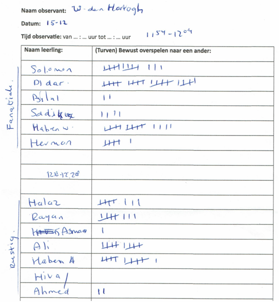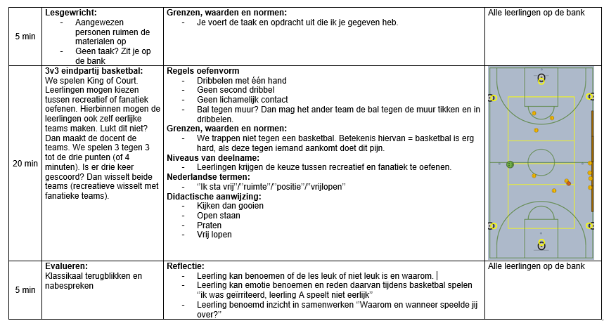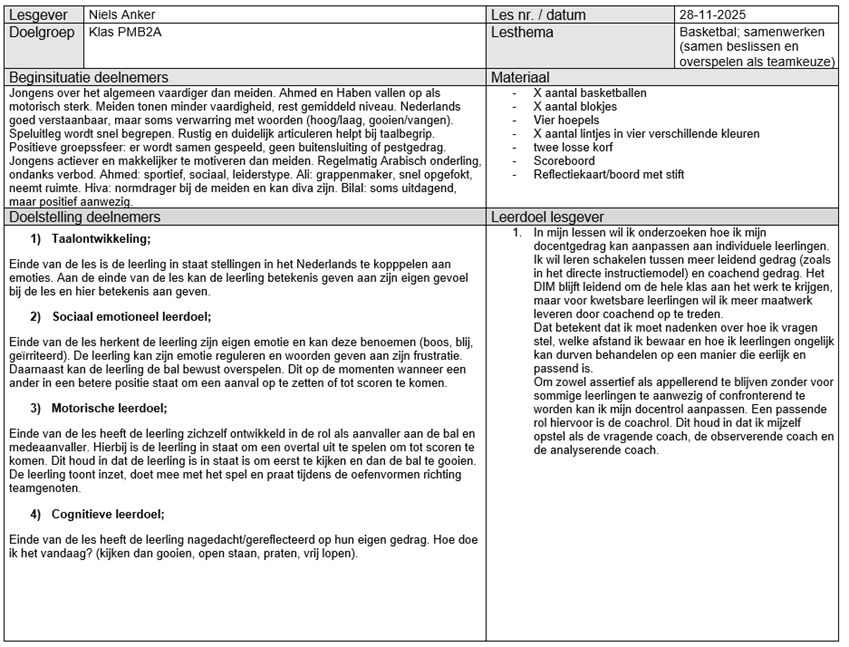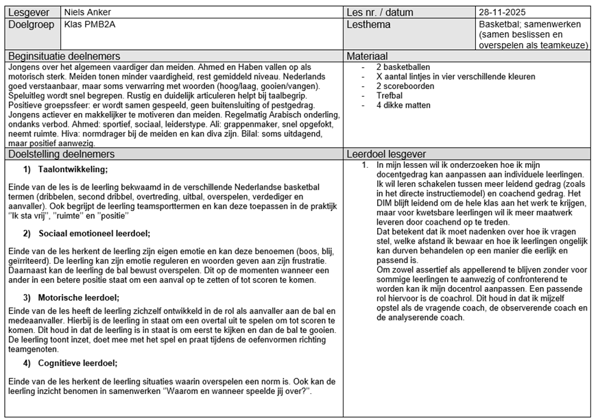 Op 1 december heb ik aan klas PMB2A de eerste basketbal les van mijn lessenreeks gegeven. Tijdens deze les hebben de leerlingen gewerkt aan het verbeteren van het bewust uitspelen van spelsituaties. Willen den Hartogh heeft tijdens de eindvorm voor mij geobserveerd hoe vaak er bewust werd overgespeeld naar een medespeler. Er zijn twee partijen van tien minuten gespeeld. Leerlingen die opvielen in het bewust overspelen waren Haben W., Haben A. en Dldar. Daarnaast viel het mij tijdens mijn eigen observatie op dat twee leerlingen (Haben W. en Dldar) Nederlands gebruikten om te communiceren en de bal te vragen tijdens de eindpartijen. Mijn ideale beeld was dat iedere leerling minstens tien keer bewust zou overspelen tijdens de eindvorm. Dit werd echter niet gehaald. De overige zeven leerlingen vielen minder op in de observaties. Dit kan meerdere oorzaken hebben, zoals motivatie, persoonlijke omstandigheden of mijn eigen handelen als lesgever. Wat ik in ieder geval weet, is dat mijn klassenmanagement tijdens deze les niet optimaal was. Zo praatte Yohanes meerdere keren door mijn openingspraatje heen. Ook tijdens de instructie van de warming up moest ik hem drie keer waarschuwen. In de eindvorm merkte ik dat hij liever niet wilde meedoen en anderen hierin meenam. Dit deed mij direct denken aan de sneeuwbalmetafoor: kleine ongewenste gedragingen kunnen snel uitgroeien tot grote problemen wanneer je ze niet tijdig corrigeert. Op mijn vorige stageplek, het Preadinius Gymnasium, had ik weinig moeite met klassenmanagement. Ook op de sport BSO kan ik kinderen gemakkelijk aanspreken op hun gedrag en hier consequenties aan verbinden. Dit is normaliter een talent van mij. Dit jaar ervaar ik dat echter als lastiger. Ik voel weerstand om streng te zijn of ‘nep boos’ te worden, omdat ik weet dat de leerlingen al genoeg aan hun hoofd hebben. Ik merk daardoor dat ik coulanter voor de groep sta en dat mijn grenzen vaker worden overschreden. Door de taalbarrière is het soms onduidelijk of normen en waarden bij alle leerlingen helder zijn. Het is mijn taak om dit voor iedereen duidelijk te maken. Omdat ik klassikaal niet veel aan het woord ben, vind ik het belangrijk dat leerlingen aandachtig luisteren op de momenten dat ik instructie geef. Tijdens het openingspraatje keek ik Yohanes meerdere keren bewust aan wanneer hij anderen afleidde. Dit zorgde steeds voor korte momenten van betrokkenheid, maar het hield niet lang stand. Ik had mijn grens eerder moeten aangeven door hem direct persoonlijk aan te spreken. Ook tijdens de instructie was drie keer waarschuwen eigenlijk te veel. Ik had hem even apart moeten zetten, zodat hij kon reflecteren op zijn gedrag. Daarna had ik een kort één op één gesprek met hem kunnen voeren. Tijdens de eindpartij had ik weinig grip meer op een klein groepje leerlingen. Hierdoor was de betrokkenheid lager en deden paar leerlingen niet meer fanatiek mee. Wat ik anders had kunnen doen was sneller en consequenter ingrijpen wanneer leerlingen afwijken van mijn verwachtingen. Ik heb in deze les duidelijk ervaren wat de gevolgen zijn van onvoldoende klassenmanagement. Zo zag ik onrust en minder betrokkenheid tijdens mijn instructies en een lagere intensiteit tijdens de eindvorm. Daarom wil ik sneller positief gedrag benoemen zodat dit gedrag wordt beloond en gezien. Voor de volgende les wil ik gedragsregels formuleren die ik tijdens de les wil nastreven. Zo wil ik dat iedereen luistert wanneer ik mijn openingspraatje of een instructie geef. Ook houden we het materiaal stil wanneer er uitleg is. Einde van de les wil ik hierop reflecteren of het nastreven hiervan gelukt is.