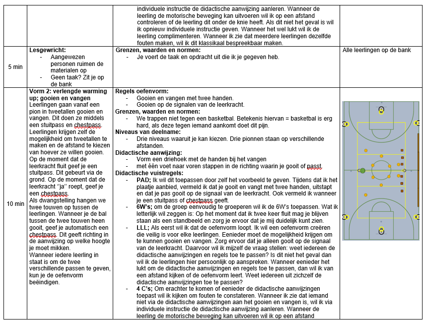 Op 15 december heb ik aan klas PMB2A de tweede basketbal les van mijn lessenreeks gegeven. Tijdens deze les hebben de leerlingen gewerkt aan het verbeteren van het bewust uitspelen van spelsituaties. Willen den Hartogh heeft tijdens de eindvorm voor mij geobserveerd hoe vaak er bewust werd overgespeeld naar een medespeler. Er zijn twee partijen van tien minuten gespeeld. Alle leerlingen zijn positief opgevallen in het bewust overspelen. Iedere leerling heeft vaker bewust overgespeeld. Dit is informatie waar we wat aan hebben! Wel kan het verschillende oorzaken hebben dat de leerlingen meer bewust hebben overgespeeld dan de eerste les. Zo heb ik klassikaal gereflecteerd in de tweede les, waarbij ik rekening hield met een actieve deelname van iedere leerling. Hierdoor konden leerlingen nadenken over hun eigen leerproces gericht op samenwerken. Ook ben ik bezig geweest met het verbeteren van mijn eigen klassenmanagement. Zo ben ik consequenter gaan handelen bij ongewenst gedrag. Hiervoor heb ik meerdere tactieken gebruikt. Zo was stap één: vragen om stilte. Word er tijdens mijn instructie voor de tweede keer door mij heen gepraat door de zelfde leerling? Dichtbij komen en persoonlijker aanspreken. Leid de betreffende leerling vooralsnog andere af? Dan zet je hem apart. Gelukkig was het niet zo ver gekomen! Na het persoonlijker aanspreken wouden leerlingen wel stil zijn en luisteren naar mijn instructie. Ook met het innen van de bal bij de afloop van een spel, moest ik dit doen met meer overtuiging. Leerlingen willen dan nog wel eens de bal wegtrappen, waarna ze doen alsof ze je niet gehoord hebben. Ik heb iedere leerling ‘streng’ aangesproken nadat een leerling dit gedrag vertoonde. Hierdoor blijf ik mijn grenzen, waarden en normen bewaken. Ik kreeg door het aanspreken geschrokken gezichten. Dit geeft aan dat ze vanaf nu weten wat mijn normen zijn. Vraag ik om de bal dan zorg je ervoor dat je de bal naar mij brengt. Verder zijn de leerlingen bezig geweest door met elkaar verschillende emoties binnen sport te bespreken tijdens de warming up. Dit werd gedaan aan de hand van casussen. Dit werd opgepakt door de hele groep. Nu is het zo dat ik meerdere casussen terug heb zien komen in de les. Zo heb ik tijdens de les een één op één gesprek gevoerd met jongen A. Hij werd boos omdat de tegenstander te fysiek speelde tijdens de eindpartij. Jongen A begon te schreeuwen tegen de tegenstander, wat duidelijk niet de juiste keuze is wanneer je dit wilt oplossen. Ik ben samen met de jongen gaan zitten en heb hem rustig kunnen krijgen. Ik kon dit moment heel mooi terug koppelen aan de warming up.