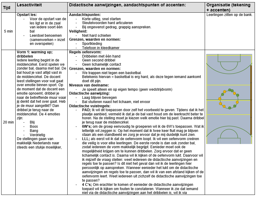 Het ontwikkelen van les 1 heb ik gebaseerd op mijn eigen visie en talentkrachtig onderwijs. De hoofddoelstellingen in les 1 zijn gericht op SEL en taalontwikkeling. Wat je mag verwachten in de les is dat dit wordt gegeven middels het vak concept ‘’het vormingstheoretische lichamelijke opvoedingsconcept’’. Tevens is het algemene uitgangspunt en doelstelling in de les gericht op het sociaal emotioneel leren (SEL) en persoonsvorming. Persoonsvorming start bij een omgeving waarin leerlingen zich veilig (sociaal en fysiek) en gezien voelen. Zo heb ik hier aandacht voor door duidelijke regels te hanteren en ruimte te laten voor emoties. Verder zijn de leerlingen bezig geweest met de sociale competentie ‘’relaties kunnen hanteren’’. Dit omvat sociale omgangsvormen zoals beleefdheid, samenwerken, sorry zeggen en dankbaarheid tonen (Van Der Heide & Kees van Overveld, z.d.). Leerlingen zijn hierin bezig geweest door met elkaar Nederlandse termen te leren tijdens de dialoogopdracht wat resulteert in het verbeteren van coachen en emotieregulatie. Binnen de ISK is taal beperkt beschikbaar om frustraties te uiten. Hierdoor kunnen leerlingen in het Nederlands aangeven waarom ze gefrustreerd zijn op een teamgenoot ‘’loopt niet vrij’’/’’staat niet in positie’’/ ‘’ziet geen ruimte’’. Verder zijn de leerlingen expliciet bezig geweest met het overspelen in de 3v2 spelsituatie en de eindpartij wat resulteert in samenwerken. Zo paste ik dwangstelling toe om één verdediger achter de aanvaller met bal te starten. Hierdoor creëer je een druk voor de aanvaller met de bal waardoor hij direct een keuze moet maken om de 1 tegen 1 uit te spelen of de bal over te spelen. Leerlingen gaan bewust of onbewust altijd voor de pass, zonder dat dit expliciet is benoemd. Ook is er ruimte voor autonomie binnen bepaalde kaders. Motivatie pak ik dan ook aan door gebruik te maken van de zelfdeterminatietheorie. Dit is een theorie van Deci & Ryan waarbij er gekeken wordt naar relatie, autonomie en competentie. Ieder leerling heeft recht om zich component te voelen middels succeservaring, verbondenheid en keuzemogelijkheden binnen hun zelfregulerend vermogen. Zo geef ik keuzemogelijkheden om te kiezen op welk niveau je aan de oefenvormen wilt deelnemen. Nu is het ook zo dat de leerlingen kunnen kiezen voor rustig of fanatiek oefenen. Hierdoor geef ik iedere leerling de ruimte om te oefenen en sporten op eigen niveau, waardoor voor iedereen de succeservaring wordt vergroot. Voor het kwetsbare individu heb ik ook aandacht besteed, door bewust in te spelen op mijn valkuilen. Dit heeft betrekking tot mijn eigen persoonlijk ontwikkelingsplan. Ik heb rekening gehouden met mijn assertieve en appellerend gedrag, wat voor kwetsbare leerlingen negatieve effecten kan hebben. Zo wil ik voor enkele leerlingen van meer leidend gedrag (zoals in het directe instructiemodel) naar coachend gedrag gaan. Het DIM blijft leidend om de hele klas aan het werk te krijgen, maar voor kwetsbare leerlingen wil ik meer maatwerk leveren door coachend op te treden.