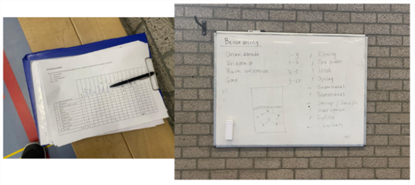 Fase 3; reflectie moment. In deze fase wil ik elke leerling een mini-reflectieformulier geven met visuele ondersteuning die zij vervolgens bij mij moeten inleveren. Met visuele ondersteuning bedoel ik het gebruik maken van plaatjes en eenvoudige Nederlandse voorbeeldzinnen/woorden. Leerlingen reflecteren op hun gedrag (gedragsregels unihockey en samenwerken/helpen). Het is toegestaan om te overleggen met een ander. In deze fase hebben de leerlingen 1 leerdoel geformuleerd waarmee zij individueel aan de slag gaan tijdens de volgende oefenvorm.
