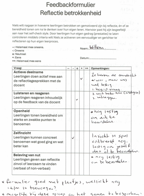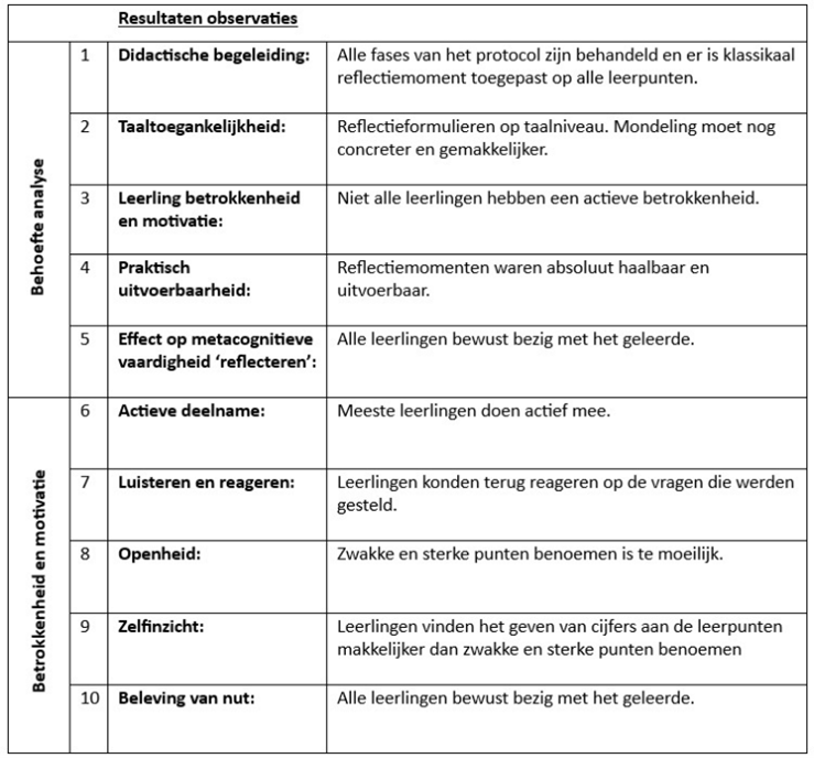 - Leerling betrokkenheid en motivatie; (Hoe te meten? Observatie tijdens reflectiemomenten)