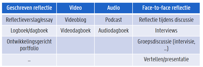 Sommigen leerlingen kunnen zich beter mondeling, schriftelijk of op een andere manier uitdrukken dan anderen. Elke manier heeft bovendien voor- en nadelen. Een geschreven reflectie heeft het voordeel van een langere houdbaarheid en geeft je de mogelijkheid om de tekst te herlezen. Een mondelinge reflectie kan dan weer de spontaniteit verhogen terwijl die aan de andere kant ook soms scherpere emoties kan uitlokken en moeilijker te herhalen is (tenzij op video). In elk geval is het belangrijk om leerlingen te laten ontdekken welke vorm het best bij hen past, maar hen ook aan te sporen om andere dingen uit te proberen en te groeien. In onderstaand figuur 1 zijn verscheidene manieren/vormen te zien hoe je zou kunnen reflecteren.