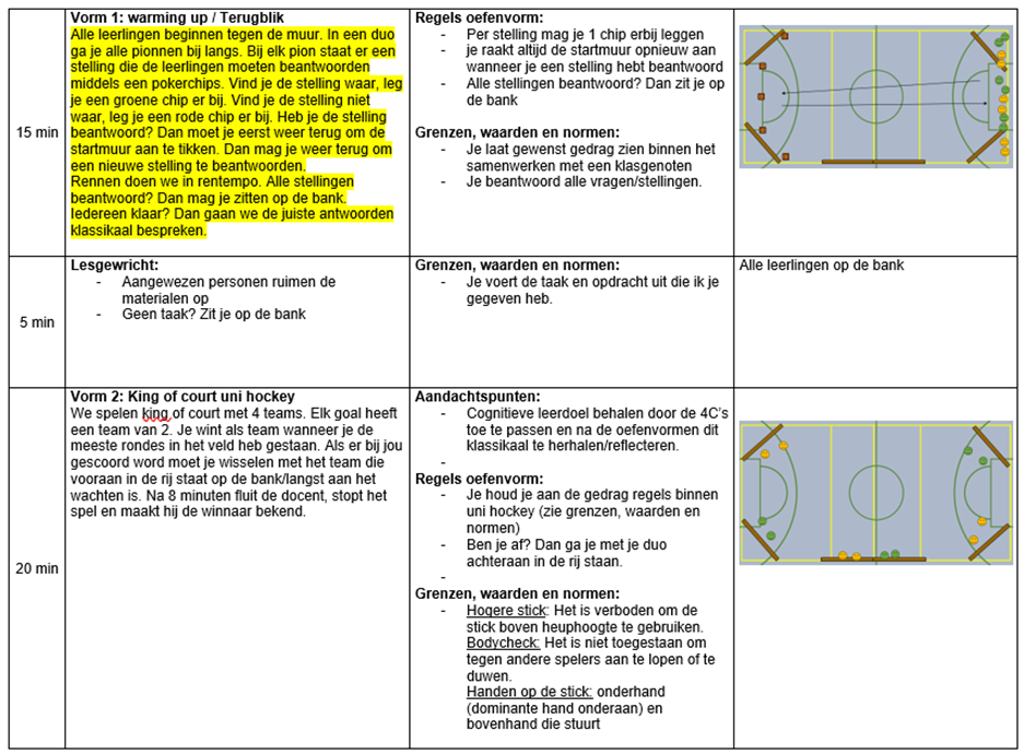 Het protocol bestaat uit een les uni hockey onderverdeeld in vijf fases (terugblikken, oefenvorm 1, reflectiemoment, oefenvorm 2 en evalueren). Onderstaand leg ik per fase uit wat de plan aanpak is om tot een succesvol opbrengst te komen: