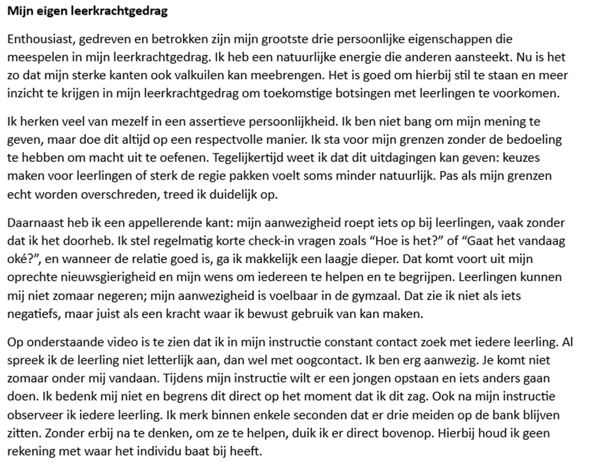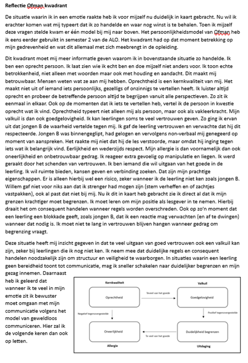 Door mijn persoonlijke eigenschappen te analyseren ben ik mij meer bewust geworden van mijn invloed op kwetsbare leerlingen en kan ik mijn pedagogisch handelen hier beter op afstemmen. Daarnaast heb ik mij ontwikkeld door mijn lesgeefstijl aan te passen van sturend naar meer coachend. Dit heeft mij geholpen om leerlingen meer ruimte te geven, vertrouwen op te bouwen en hen te ondersteunen in hun sociaal-emotionele ontwikkeling. Het toepassen geweldloos communicatie heeft mijn communicatievaardigheden versterkt en draagt bij aan een veilig pedagogisch leerklimaat.