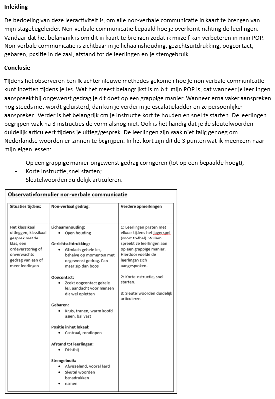 Door het analyseren van de beginsituatie ben ik beter in staat om mijn lessen af te stemmen op de verschillende niveaus en behoeften van leerlingen. Daarnaast ben ik zelfverzekerder en consequenter geworden in mijn handelen vanuit mijn eigen grenzen, waarden en normen, wat heeft gezorgd voor meer structuur en duidelijkheid in mijn lessen. Op didactisch gebied heb ik mij ontwikkeld door het inzetten van leskaarten en het bieden van autonomie. Door aandacht te besteden aan reflectie kunnen leerlingen in mijn les meer verantwoordelijkheid nemen voor hun eigen leerproces. Gesproken over motorisch leren kan ik dit nu effectiever toepassen. Ook mijn non-verbale communicatie is verbeterd, wat bijdraagt aan duidelijke instructies en een beter klassenmanagement.