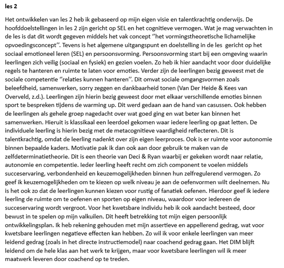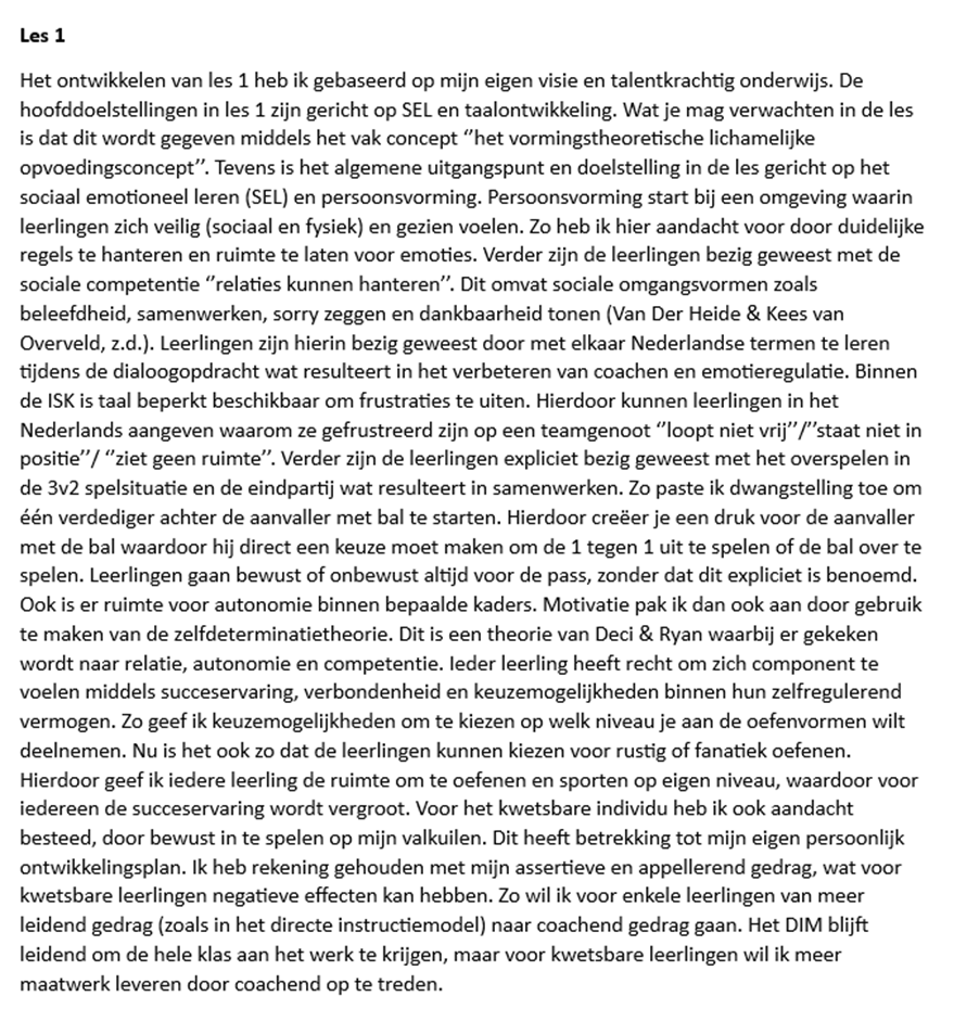Om aan te kunnen tonen dat ik aan de leeruitkomst ‘vakinhoudelijk’ voldoe, heb ik lessen gerealiseerd, verantwoord en geëvalueerd. Dit deed ik vanuit gegeven kaders. De lesthema’s waren al bepaald alleen mocht ik zelf de lessen inrichten. Dit deed ik vanuit mijn visie op het bewegingsonderwijs, maatschappelijke- en pedagogische opvattingen. Deze heb ik dan ook uitgewerkt. Dit heb ik ook voorafgaand aan een les verantwoord en uitgeschreven. Ook heb ik een eigen leerlijn gemaakt en uitgeschreven die nog niet bestond in het vakwerkplan van de ISK. Eén lessenreeks van de betreffende leerlijn heb ik dan ook volledig uitgewerkt.